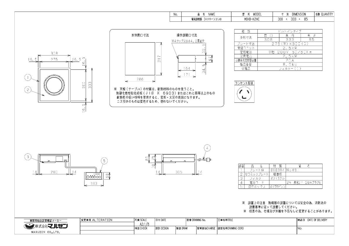 MIHB-K2HC 【マルゼン】IHクリーンコンロ ビルトインタイプ 幅308×奥行333×高さ85 単相200V