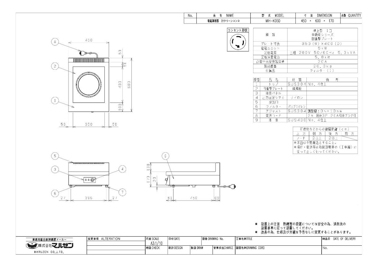 MIH-K05D 【マルゼン】IHクリーンコンロ 幅450×奥行600×高さ170 三相200V