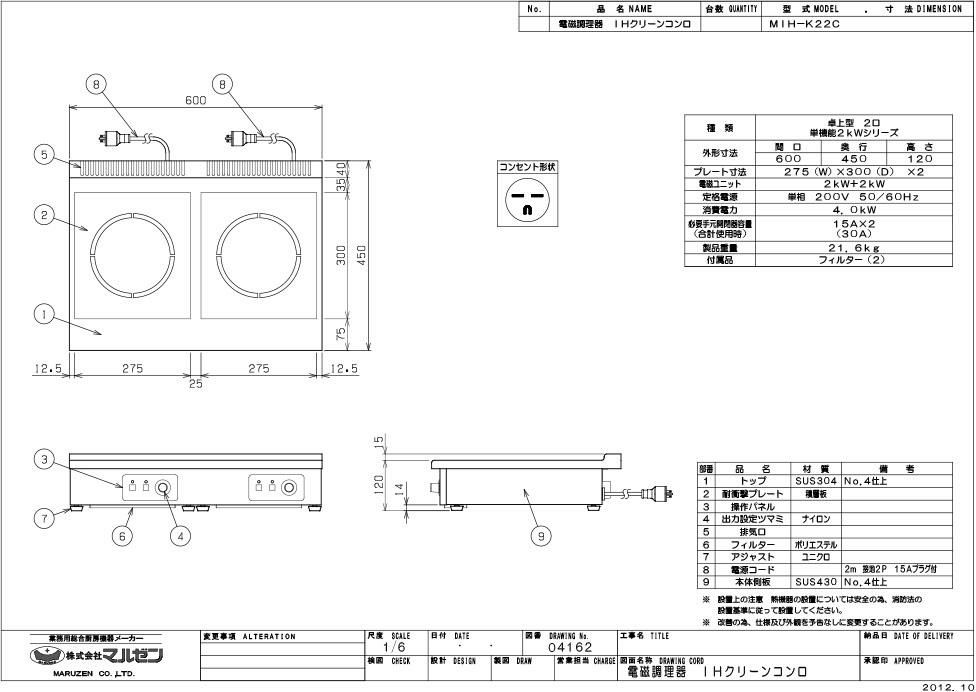 MIH-K22C 【マルゼン】IHクリーンコンロ 幅600×奥行450×高さ120 単相200V 50/60Hz