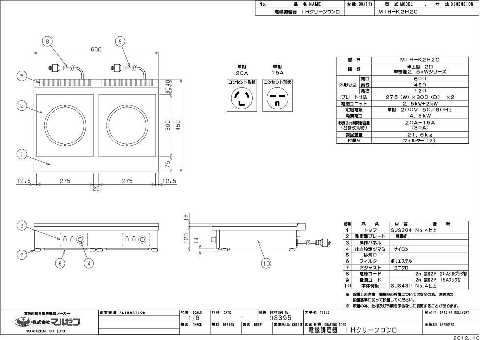MIH-K2H2C 【マルゼン】IHクリーンコンロ 幅600×奥行450×高さ120 単相200V 50/60Hz