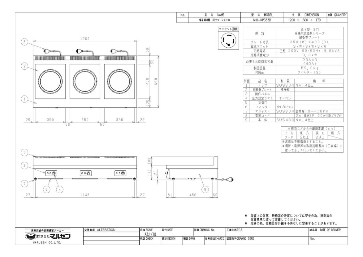 MIH-KP333B 【マルゼン】IHクリーンコンロ 幅1200×奥行600×高さ170 三相200V