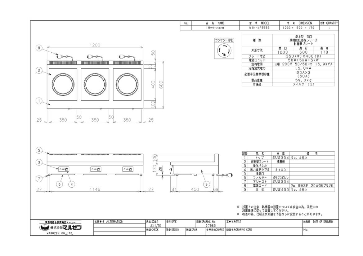 【マルゼン】IHクリーンコンロ MIH-KP555B 幅1200×奥行600×高さ170 三相200V