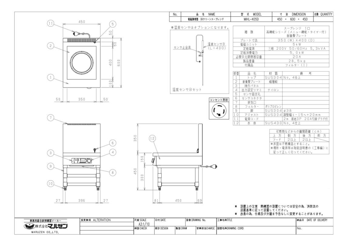 【マルゼン】IHスープレンジ MIHL-K05D 幅450×奥行600×高さ450 三相200V
