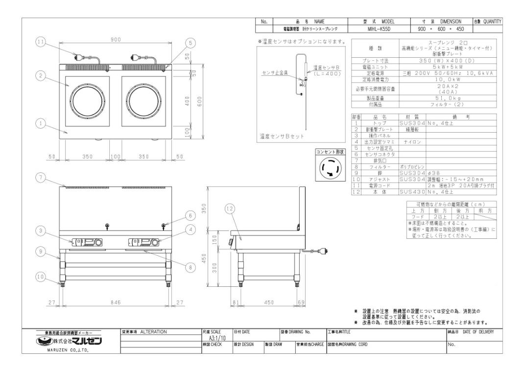 【マルゼン】IHスープレンジ MIHL-K55D 幅900×奥行600×高さ450 三相200V