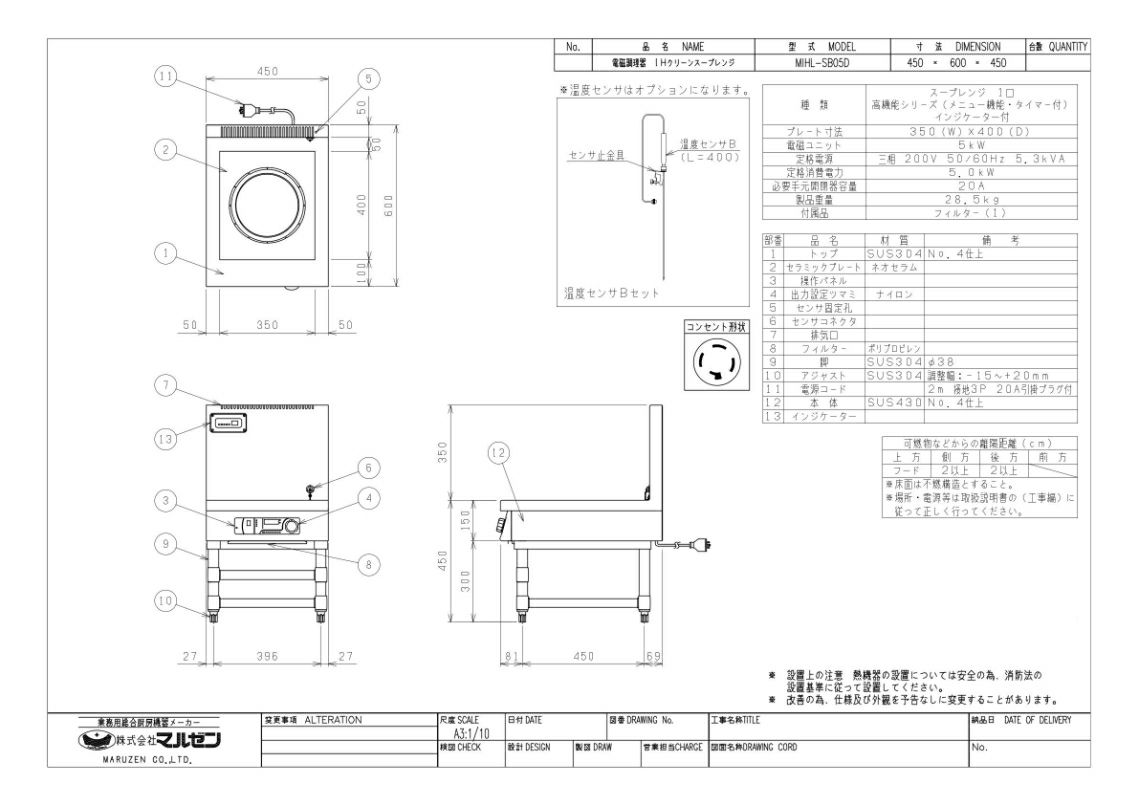 【マルゼン】IHスープレンジ インジケーター付 MIHL-SB05D 幅450×奥行600×高さ450 三相200V