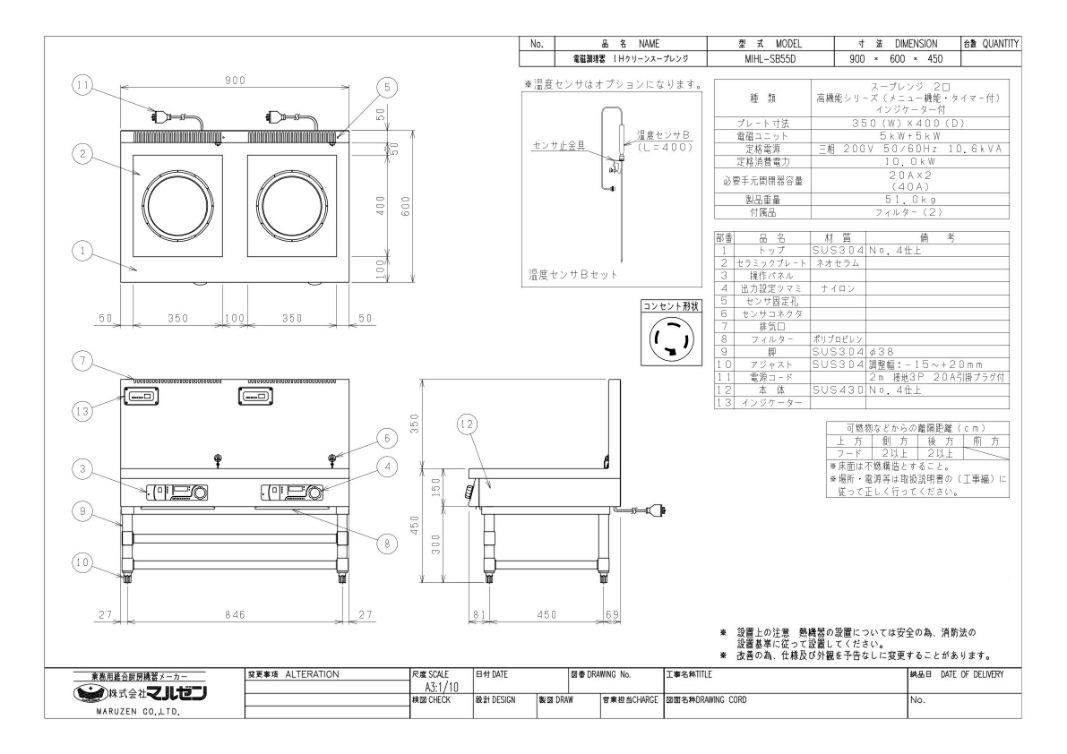 【マルゼン】IHスープレンジ インジケーター付 MIHL-SB55D 幅900×奥行600×高さ450 三相200V