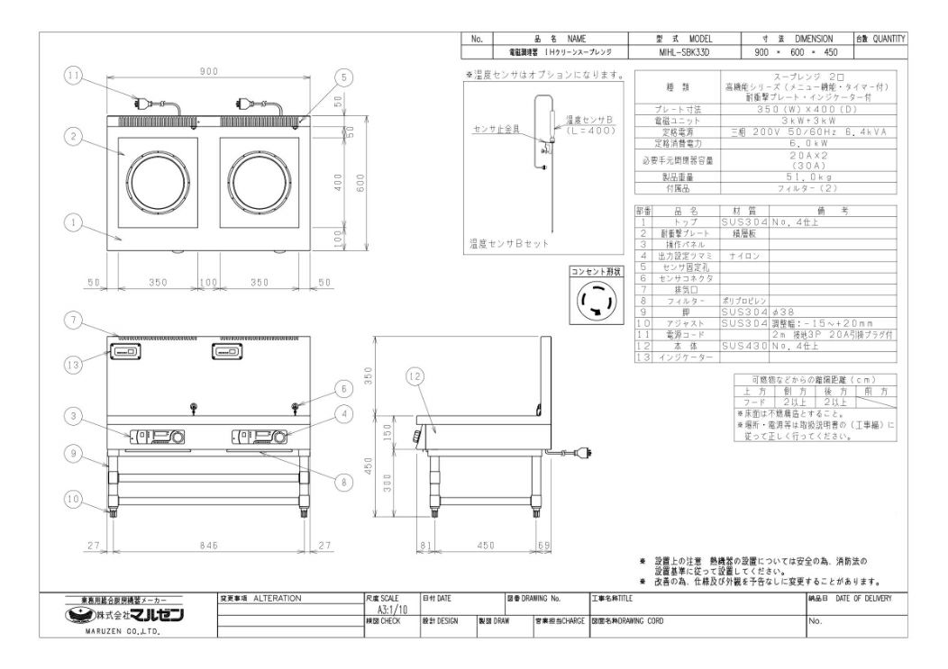 【マルゼン】IHスープレンジ インジケーター付 MIHL-SBK33D 幅900×奥行600×高さ450 三相200V