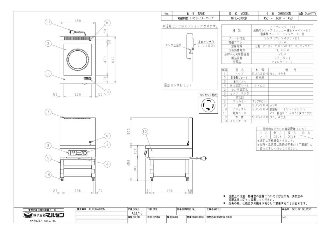 【マルゼン】IHスープレンジ インジケーター付 MIHL-SK03D 幅450×奥行600×高さ450 三相200V