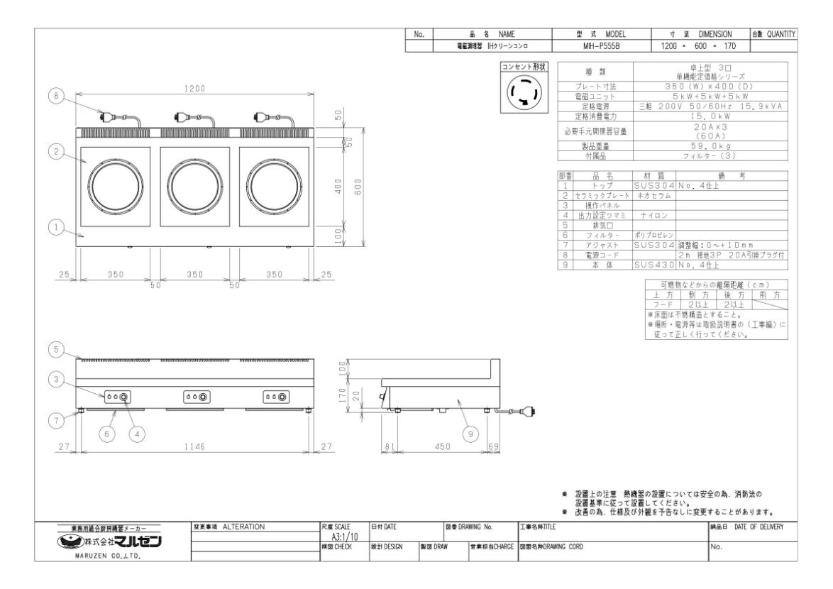MIH-P555B 【マルゼン】IHクリーンコンロ 幅1200×奥行600×高さ170 三相200V