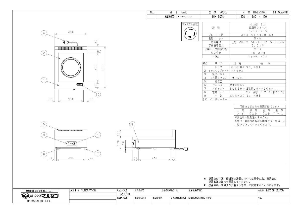 MIH-S05D 【マルゼン】IHクリーンコンロ インジケーター付 幅450×奥行600×高さ170 三相200V