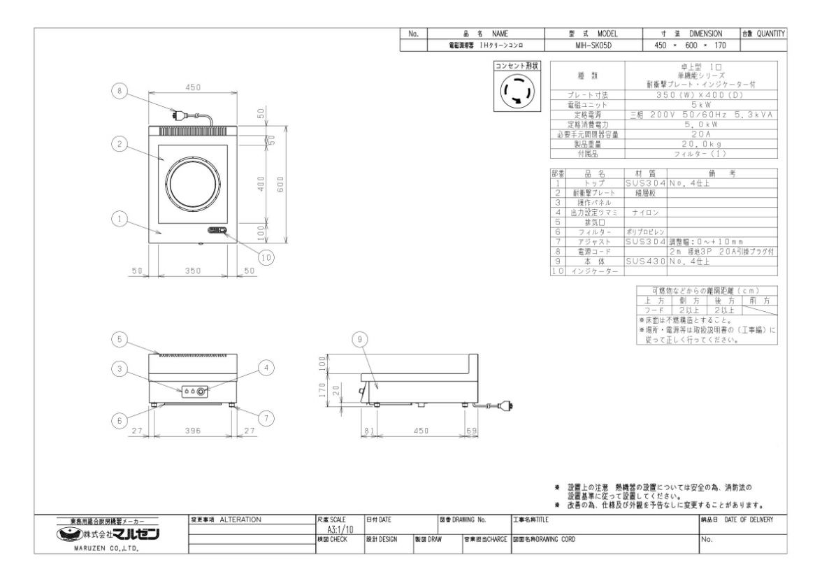 MIH-SK05D 【マルゼン】IHクリーンコンロ インジケーター付 幅450×奥行600×高さ170 三相200V