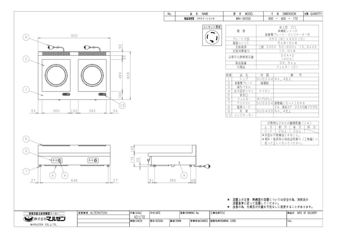 MIH-SK55D 【マルゼン】IHクリーンコンロ インジケーター付 幅900×奥行600×高さ170 三相200V