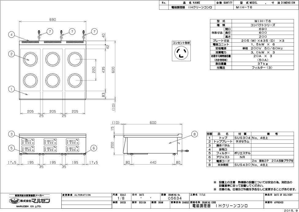MIH-T6 【マルゼン】IHクリーンコンロ コンパクトタイプ 幅690×奥行600×高さ200 単相200V