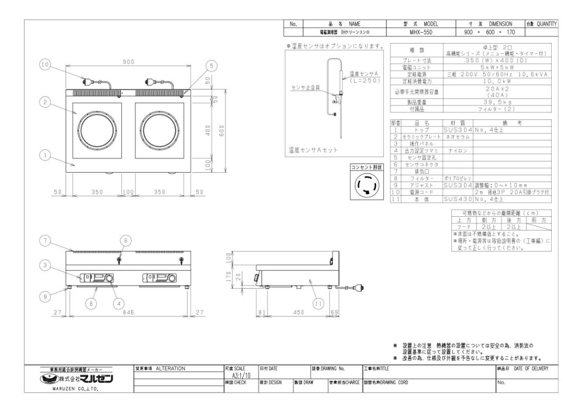 MIHX-55D 【マルゼン】IHクリーンコンロ 幅900×奥行600×高さ170 三相200V