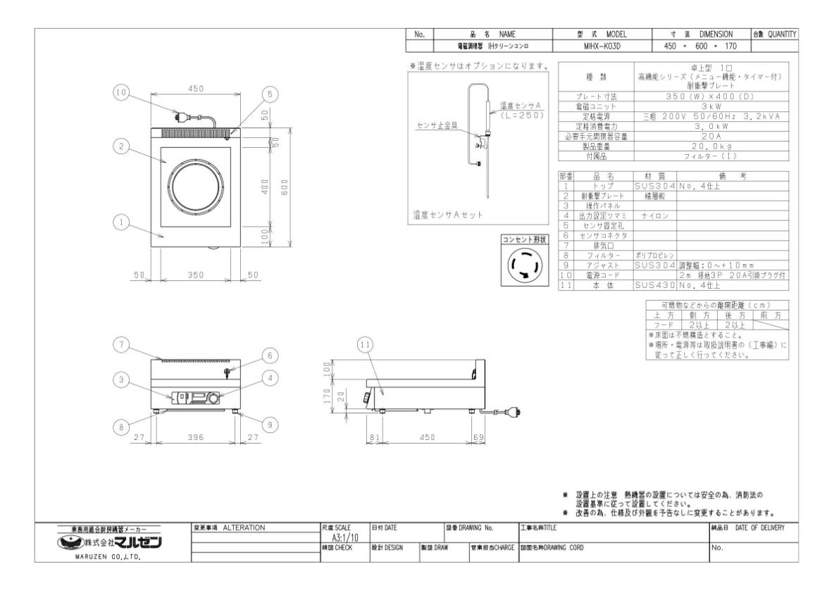 MIHX-K03D 【マルゼン】IHクリーンコンロ 幅450×奥行600×高さ170 三相200V