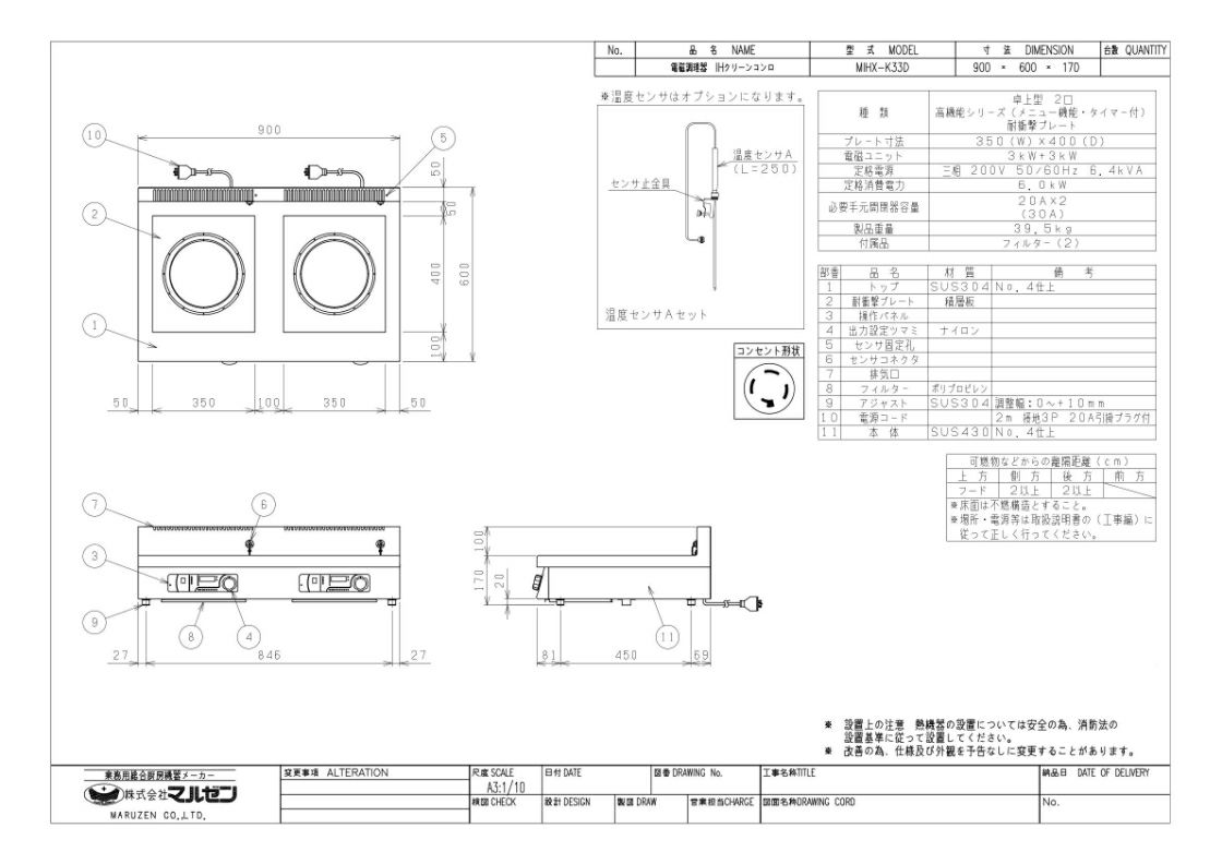MIHX-K33D 【マルゼン】IHクリーンコンロ 幅900×奥行600×高さ170 三相200V