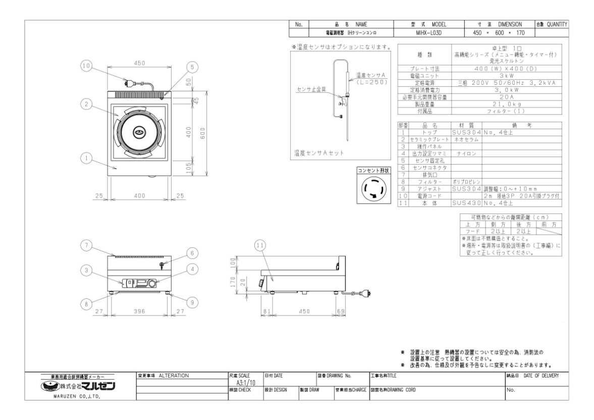 MIHX-L03D 【マルゼン】IHクリーンコンロ 幅450×奥行600×高さ170 三相200V