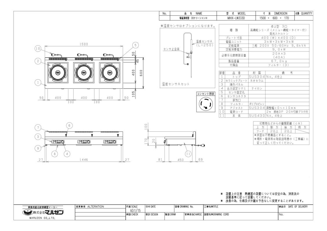 MIHX-LW333D 【マルゼン】IHクリーンコンロ 幅1500×奥行600×高さ170 三相200V