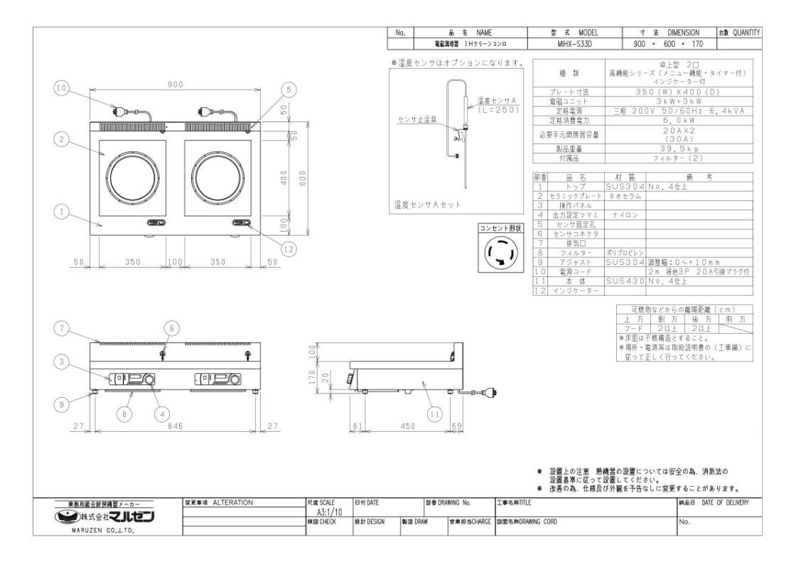 MIHX-S33D 【マルゼン】IHクリーンコンロ インジケーター付 幅900×奥行600×高さ170 三相200V