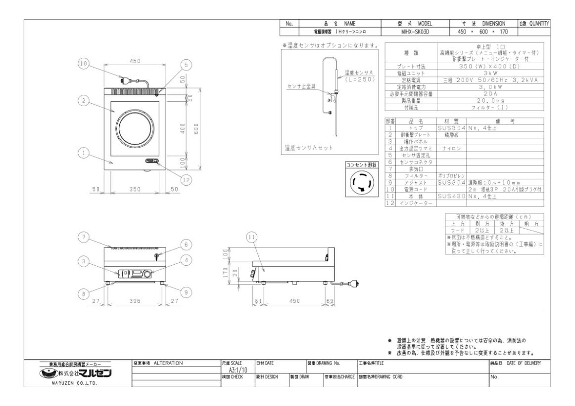 MIHX-SK03D 【マルゼン】IHクリーンコンロ インジケーター付 幅450×奥行600×高さ170 三相200V