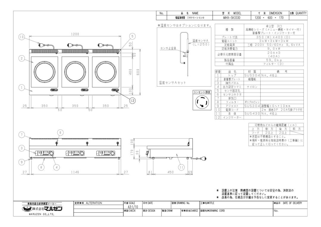 MIHX-SK333D 【マルゼン】IHクリーンコンロ インジケーター付 幅1200×奥行600×高さ170 三相200V
