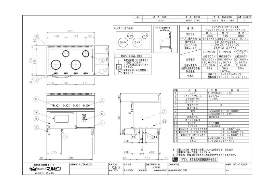 商品名:IHレンジ コンベクションオーブン搭載 W1200×D750×H850