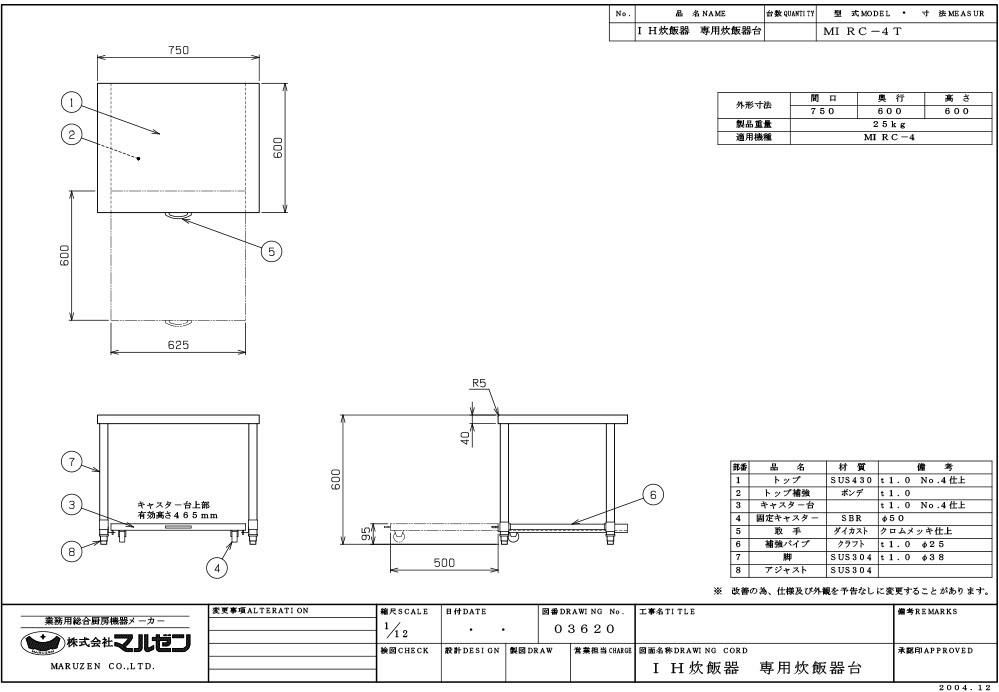 【マルゼン】IH炊飯器専用架台 MIRC-4T 幅750×奥行600×高さ600