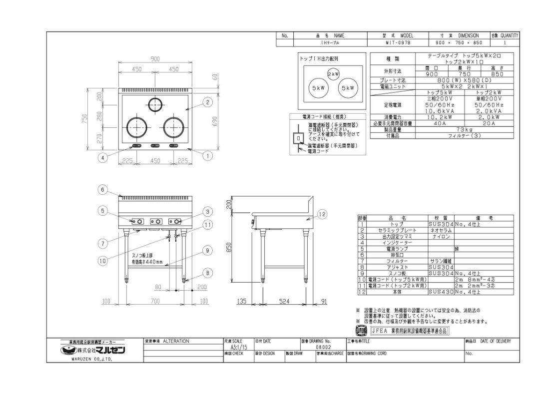 【マルゼン】IHテーブル MIT-097B 幅900×奥行750×高さ850