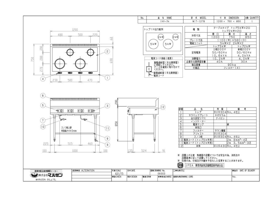 商品名:IHテーブル W1200×D750×H850