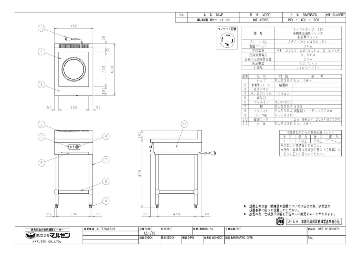 【マルゼン】IHテーブル MIT-KP03B 幅450×奥行600×高さ800 三相200V