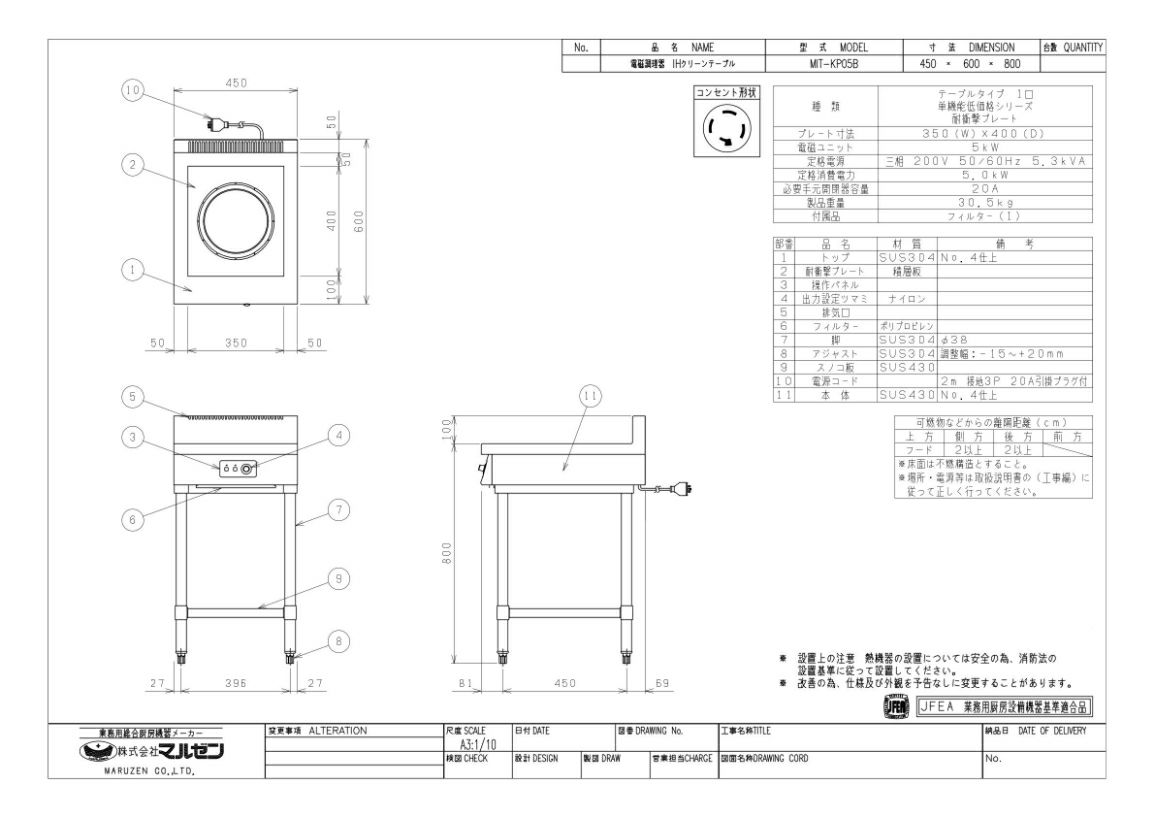 【マルゼン】IHテーブル MIT-KP05B 幅450×奥行600×高さ800 三相200V