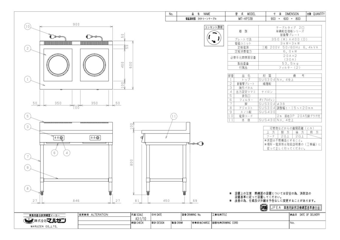 【マルゼン】IHテーブル MIT-KP33B 幅900×奥行600×高さ800 三相200V