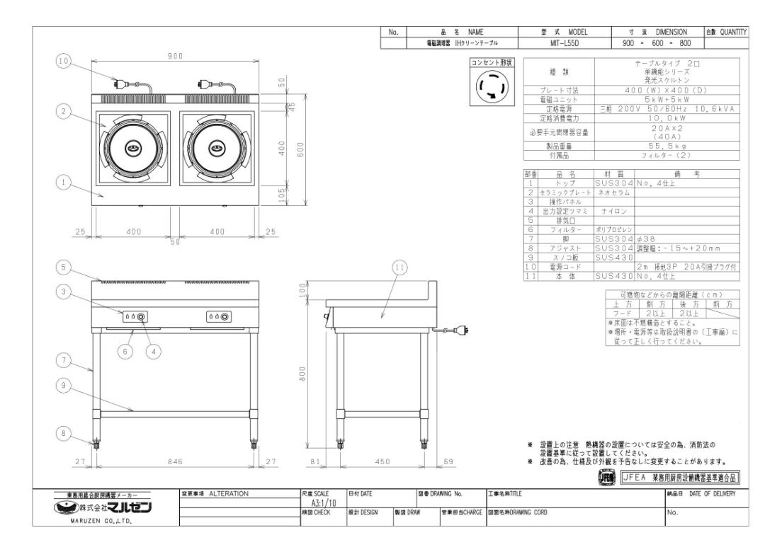 【マルゼン】IHテーブル MIT-L55D 幅900×奥行600×高さ800 三相200V