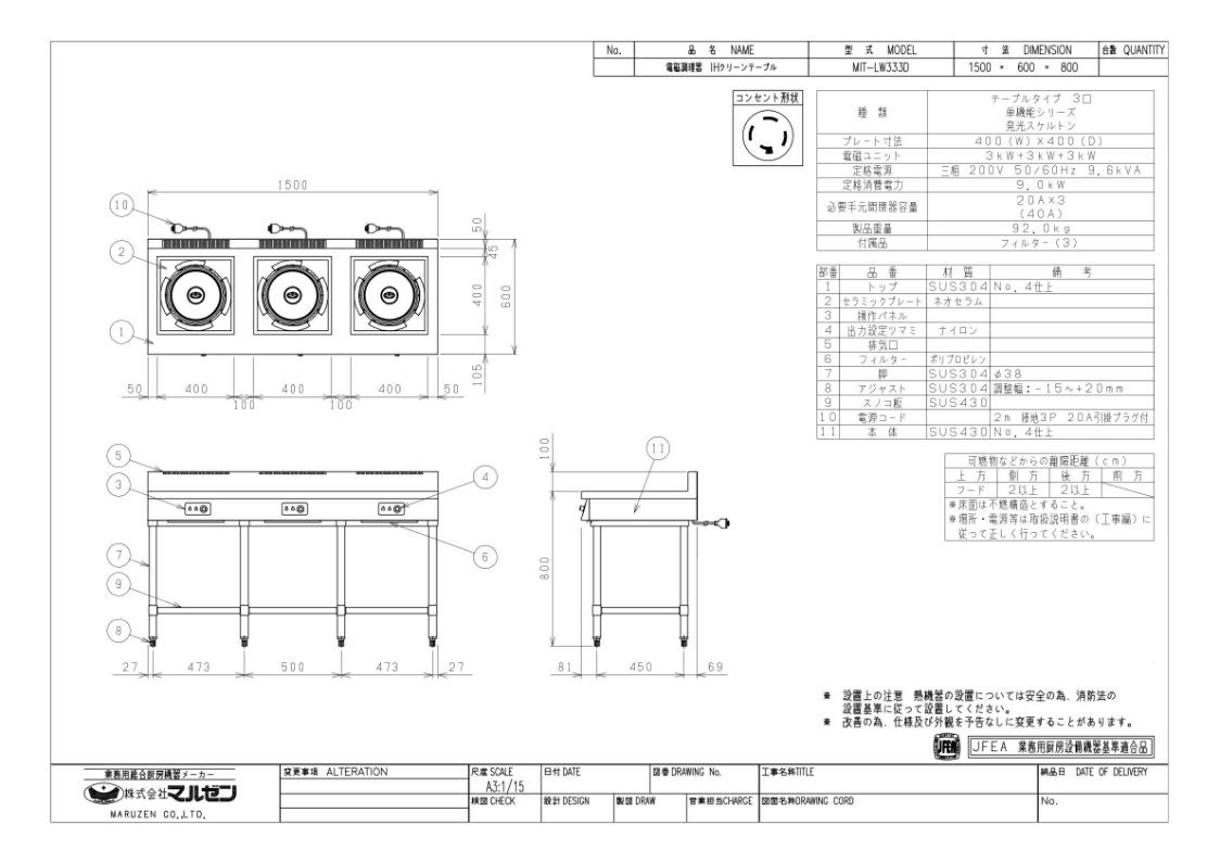 【マルゼン】IHテーブル MIT-LW333D 幅1500×奥行600×高さ800 三相200V