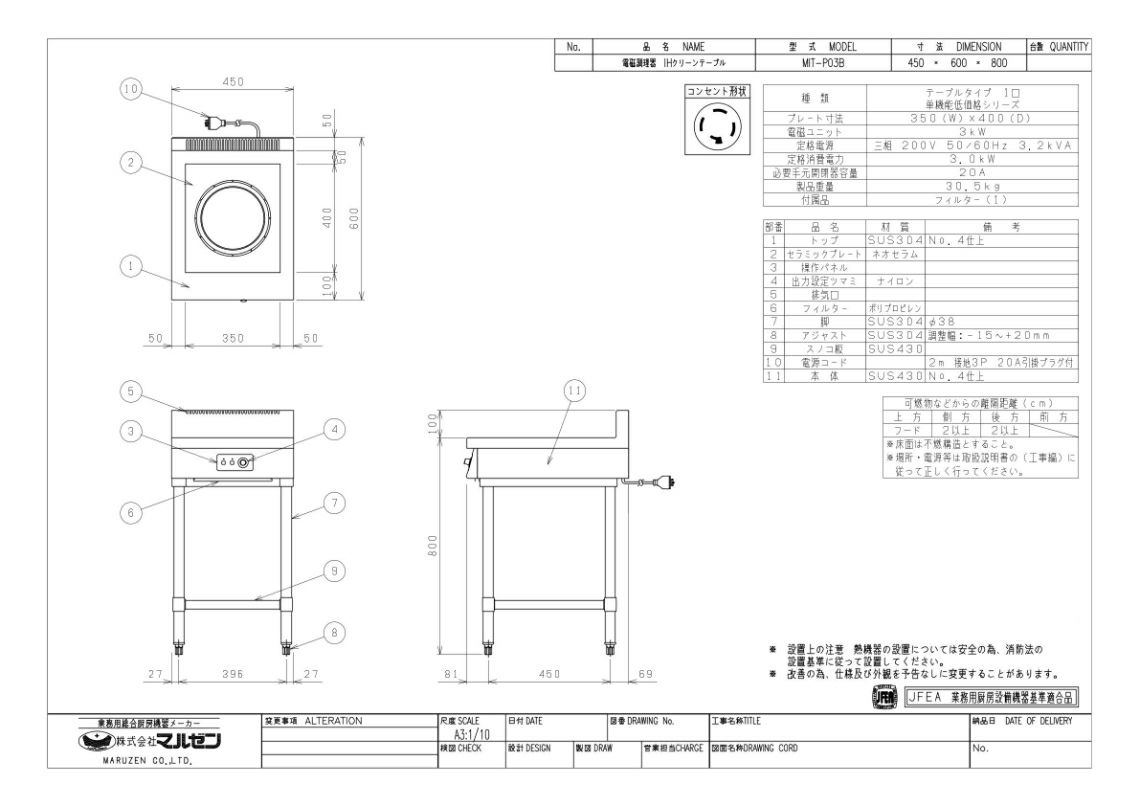 【マルゼン】IHテーブル MIT-P03B 幅450×奥行600×高さ800 三相200V
