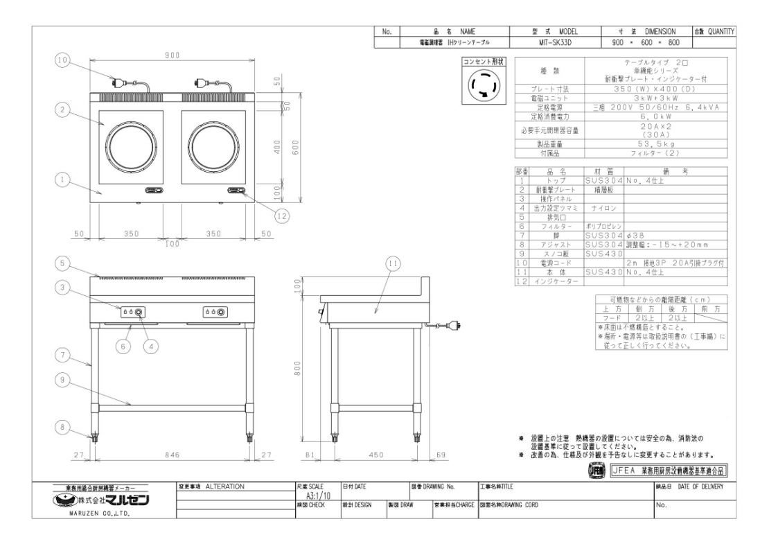 【マルゼン】IHテーブル インジケーター付 MIT-SK33D 幅900×奥行600×高さ800 三相200V