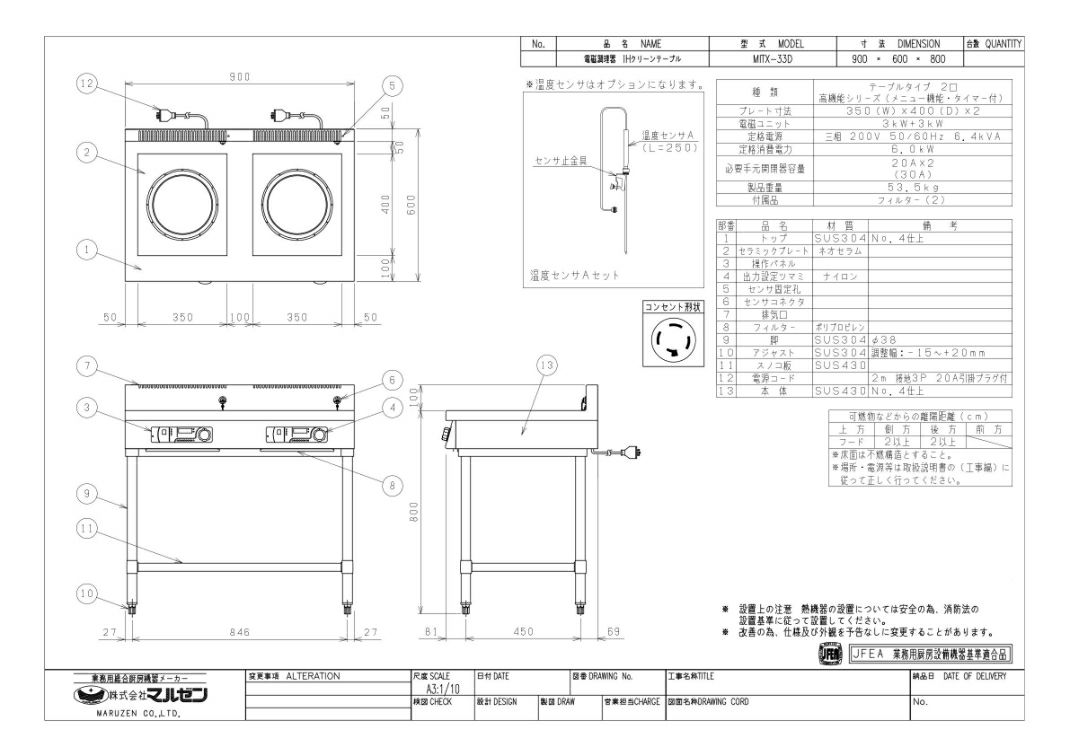 【マルゼン】IHテーブル MITX-33D 幅900×奥行600×高さ800 三相200V