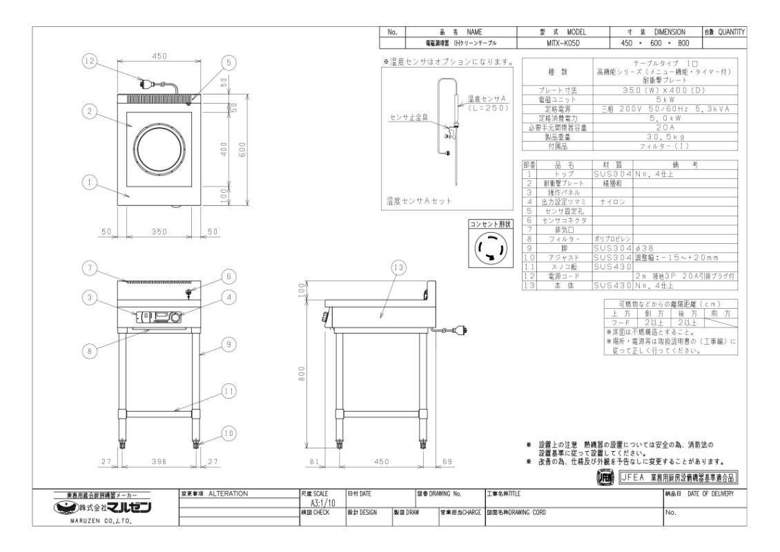 【マルゼン】IHテーブル MITX-K05D 幅450×奥行600×高さ800 三相200V