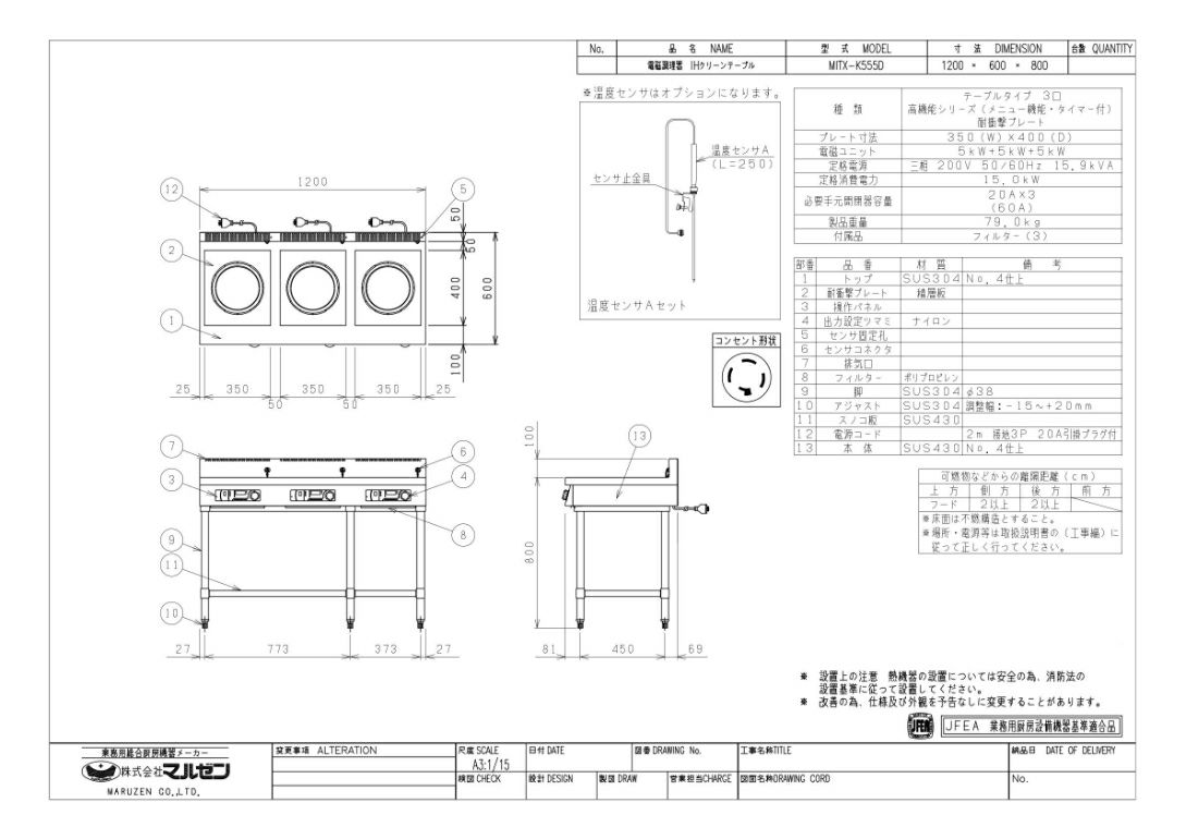 【マルゼン】IHテーブル MITX-K555D 幅1200×奥行600×高さ800 三相200V