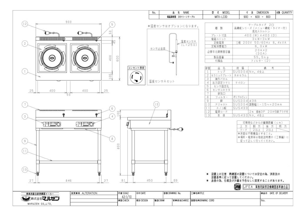 【マルゼン】IHテーブル MITX-L33D 幅900×奥行600×高さ800 三相200V