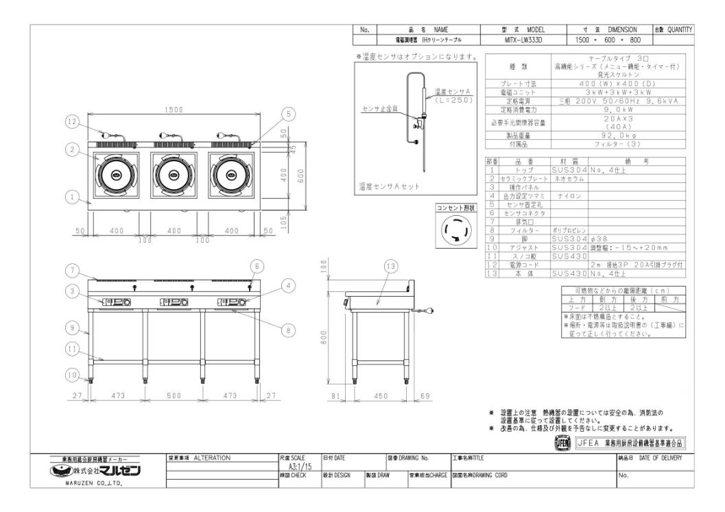 【マルゼン】IHテーブル MITX-LW333D 幅1500×奥行600×高さ800 三相200V
