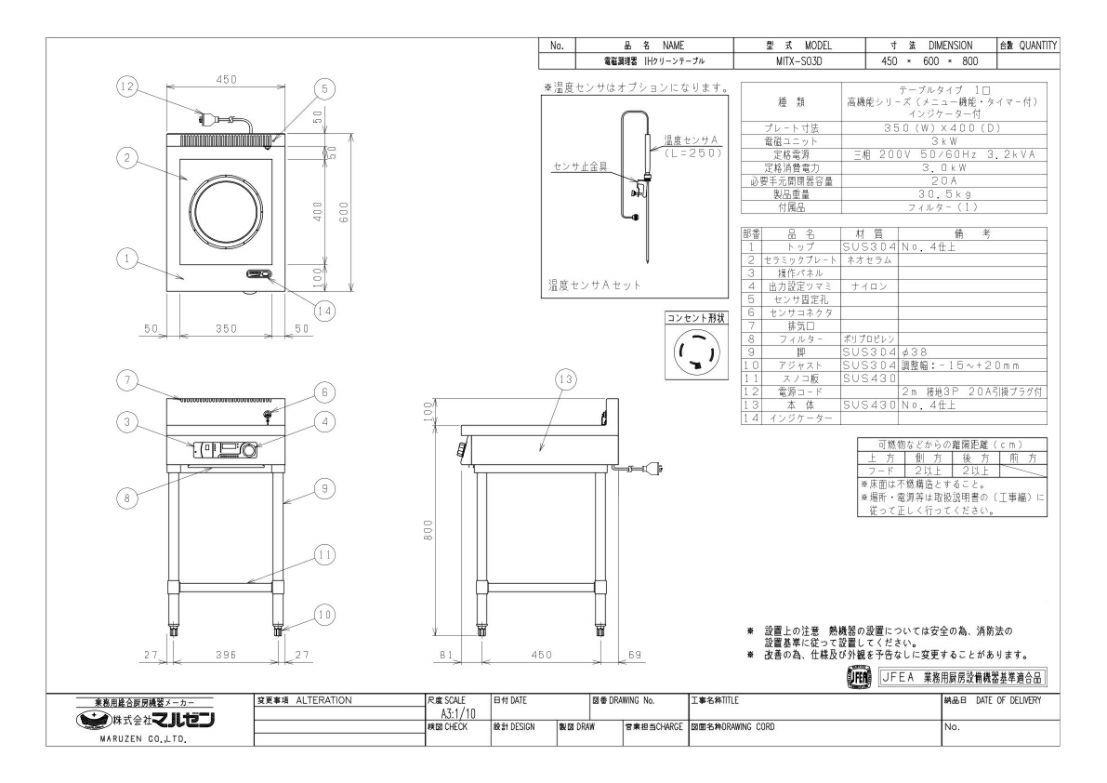 【マルゼン】IHテーブル インジケーター付 MITX-S03D 幅450×奥行600×高さ800 三相200V