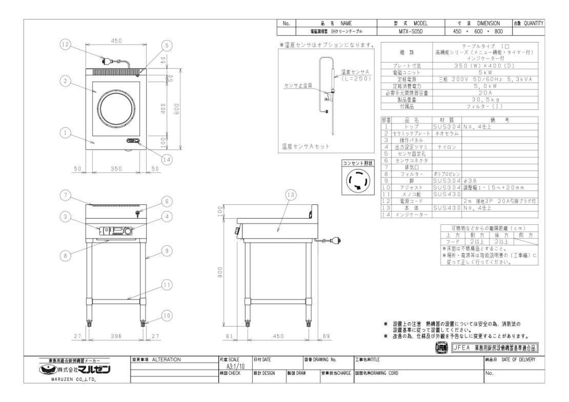 【マルゼン】IHテーブル インジケーター付 MITX-S05D 幅450×奥行600×高さ800 三相200V