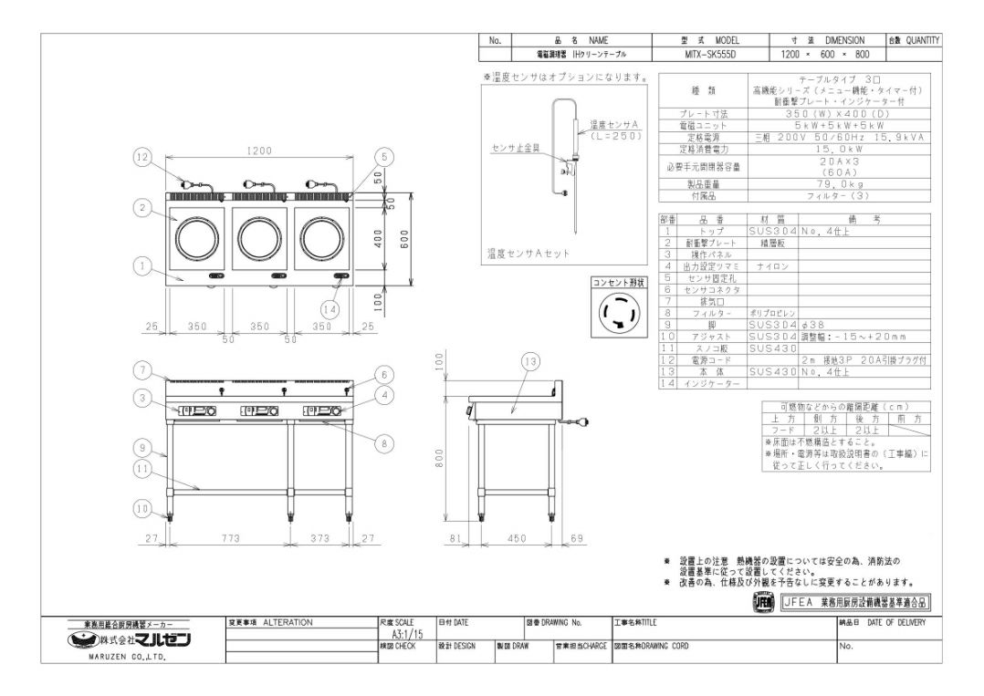 【マルゼン】IHテーブル インジケーター付 MITX-SK555D 幅1200×奥行600×高さ800 三相200V