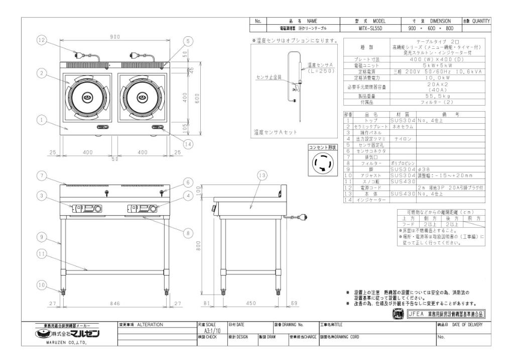 【マルゼン】IHテーブル インジケーター付 MITX-SL55D 幅900×奥行600×高さ800 三相200V