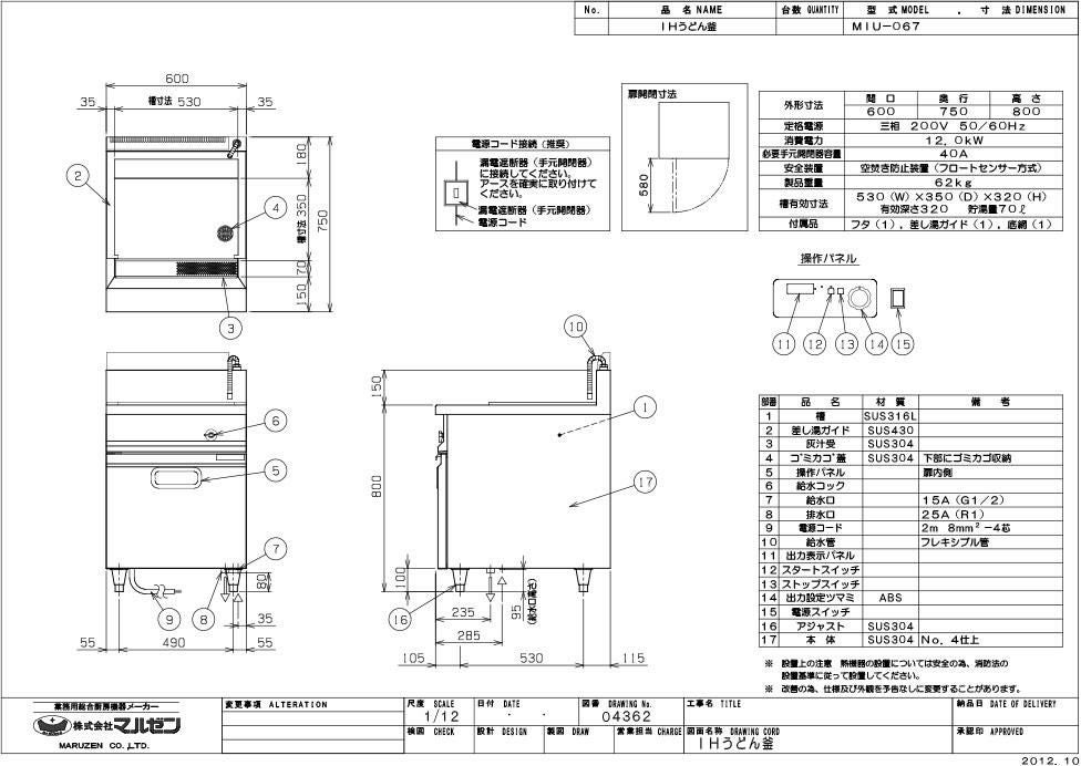 【マルゼン】IHうどん釜 大量仕様 MIU-067 幅600×奥行750×高さ800mm