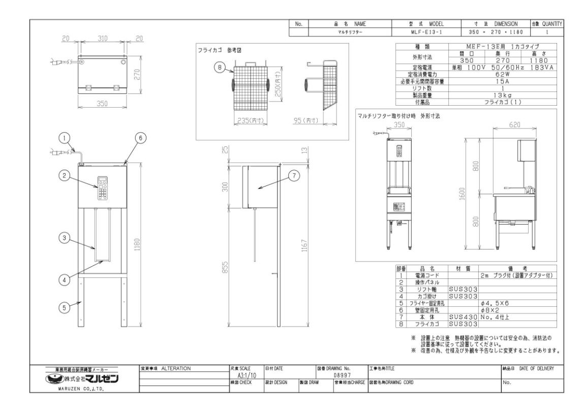MLF-E13-1 【マルゼン】 マルチリフター MEF-13E用 1カゴタイプ 単相100V 幅350×奥行270×高さ1180