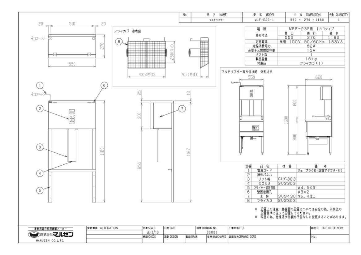 MLF-E23-1 【マルゼン】 マルチリフター MEF-23E用 1カゴタイプ 単相100V 幅550×奥行270×高さ1180