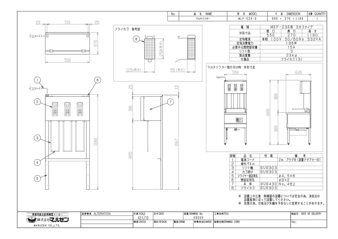MLF-E23-3 【マルゼン】 マルチリフター MEF-23E用 3カゴタイプ 単相100V 幅550×奥行270×高さ1180