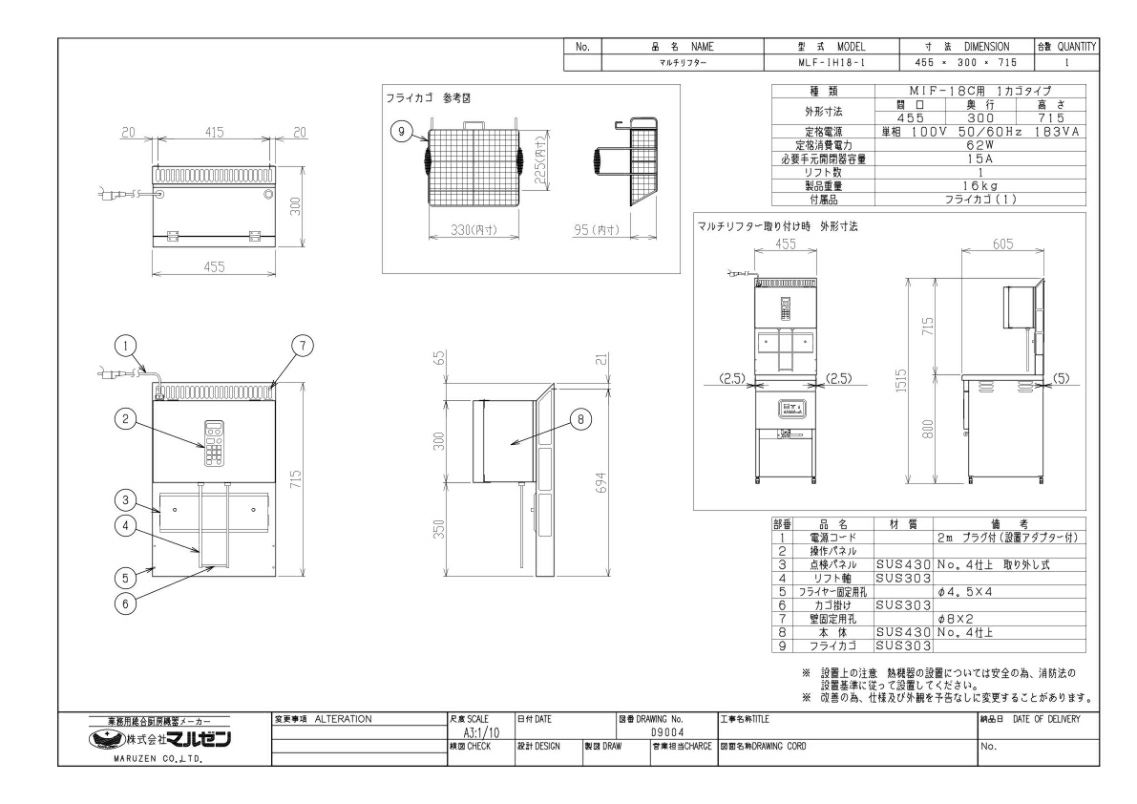 MLF-IH18-1 【マルゼン】 マルチリフター MIF-18C用 1カゴタイプ 単相100V 幅455×奥行300×高さ715